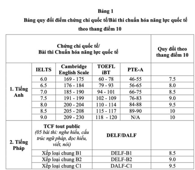 Mức quy đổi theo thang điểm 10 của các chứng chỉ quốc tế/bài thi chuẩn hóa năng lực quốc tế như sau: