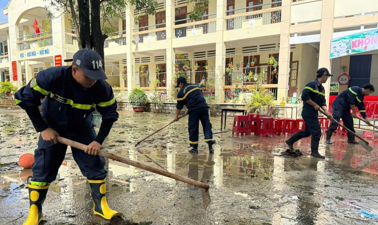 Công an thành phố Hồ Chí Minh cùng chính quyền, người dân Đắk Lắk khắc phục hậu quả lũ lụt. Ảnh: MOET