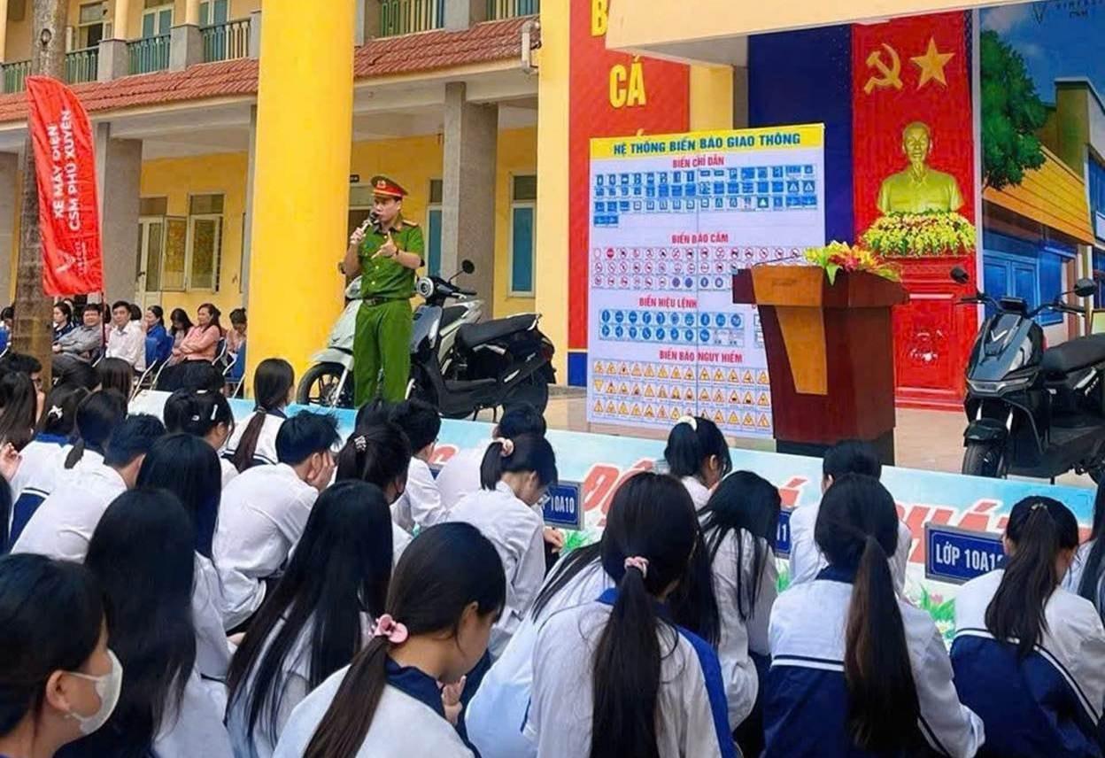 Bên cạnh đó, báo cáo viên cũng trực tiếp hướng dẫn các kỹ năng điều khiển xe an toàn, cách xử lý tình huống khi tham gia giao thông, giúp học sinh trang bị kiến thức thực tiễn cần thiết. Nội dung tuyên truyền được truyền tải sinh động, dễ hiểu, phù hợp với lứa tuổi, góp phần tạo sự hứng thú và tương tác tích cực trong học sinh.