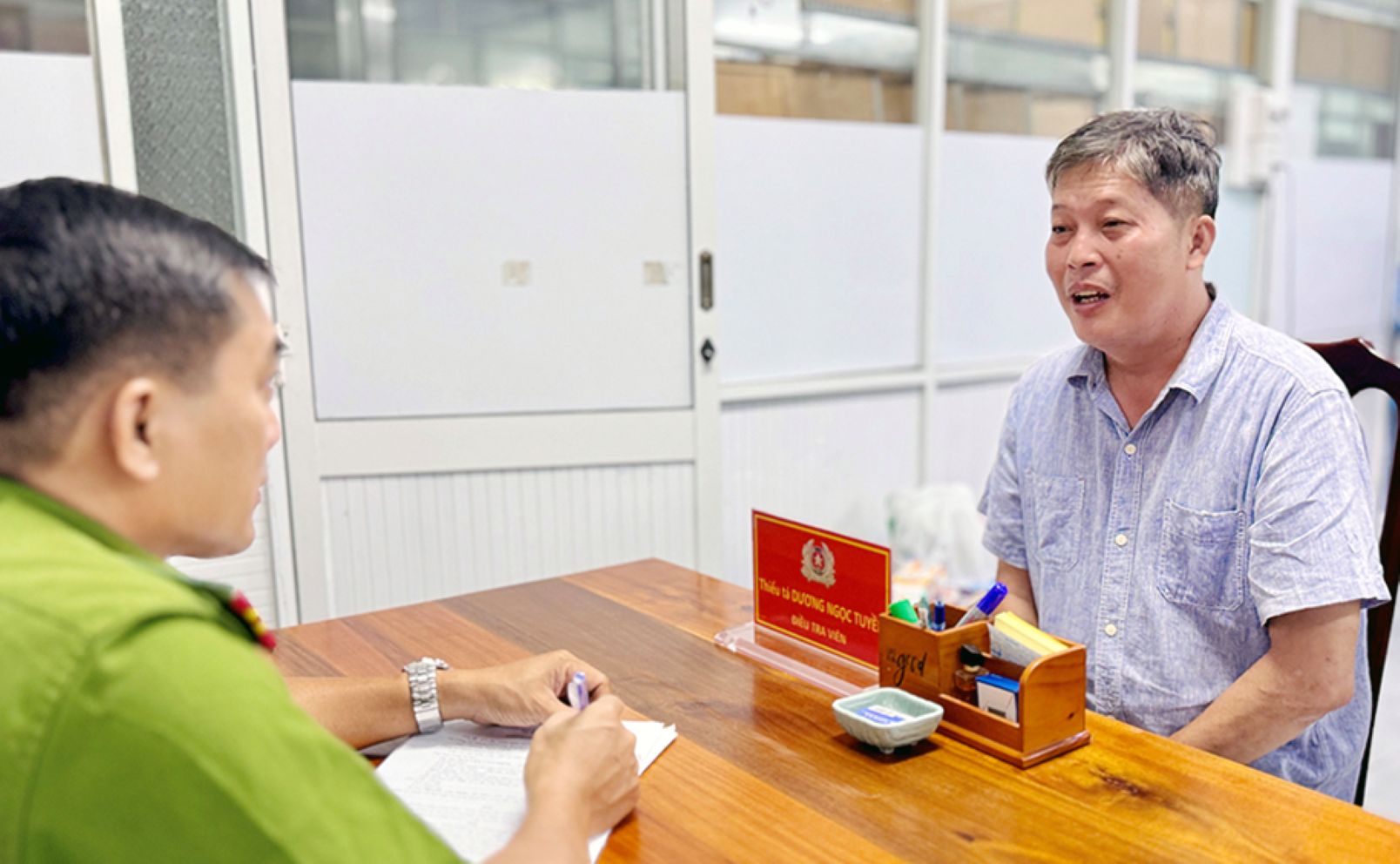 Thi hành Lệnh bắt tạm giam bị can Đinh Lương Nghĩa. Ảnh: Vũ Tiến