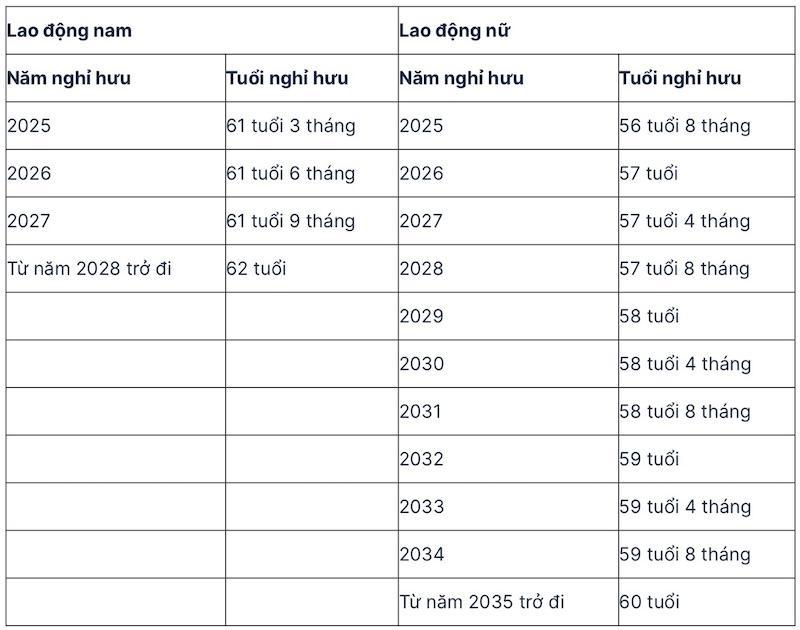 Năm 2025, độ tuổi nghỉ hưu của người lao động nam sẽ là 61 tuổi 3 tháng, lao động nữ sẽ là 56 tuổi 8 tháng; năm 2026, độ tuổi nghỉ hưu của người lao động nam sẽ là 61 tuổi 6 tháng, lao động nữ sẽ là 57 tuổi;...