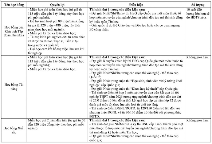 Tại Đại học Phenikaa, quỹ học bổng dành cho sinh viên nhập học đại học chính quy năm 2026 được thành lập từ nhiều nguồn: Tài trợ từ Tập đoàn Phenikaa; tài trợ từ các công ty thành viên của Tập đoàn Phenikaa; tài trợ từ các doanh nghiệp, đối tác; tài trợ từ các trường đại học, viện nghiên cứu và các đối tác quốc tế với tổng giá trị trên 50 tỉ đồng.