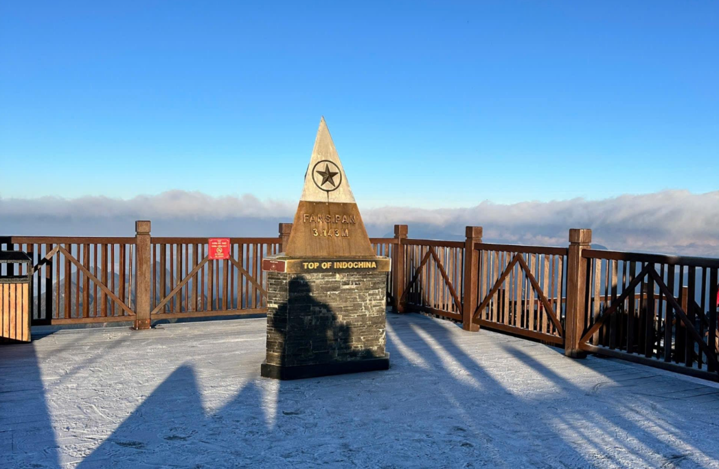 Đỉnh Fansipan lúc sáng 25-12 phủ trắng băng tuyết. Từ đêm 24-12 đến rạng sáng 25-12, nhiệt độ khu vực đỉnh Fansipan chỉ dao động khoảng 1–3°C. Lớp băng dày nhất từ đầu mùa đông đến nay phủ kín lối đi, mái đá và khu vực cột cờ. Ảnh: H.L