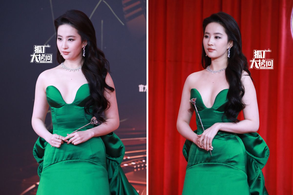 Tuy nhiên, diện mạo lần này của Lưu Diệc Phi gây tranh cãi. Cô diện đầm Haute Couture màu xanh lá của thương hiệu Miss Sohee, có kiểu dáng cúp ngực, ôm sát.