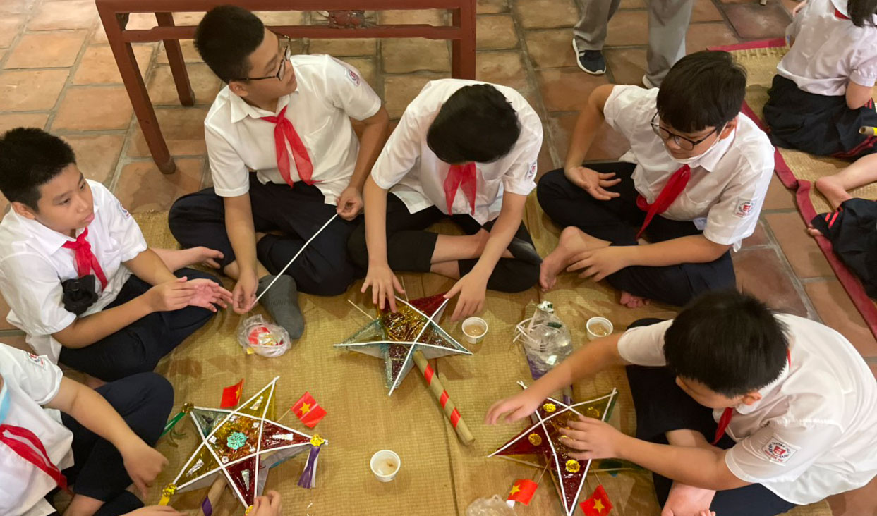 Các em thiếu nhi trải nghiệm làm đèn ông sao tại đình Kim Ngân (quận Hoàn Kiếm)