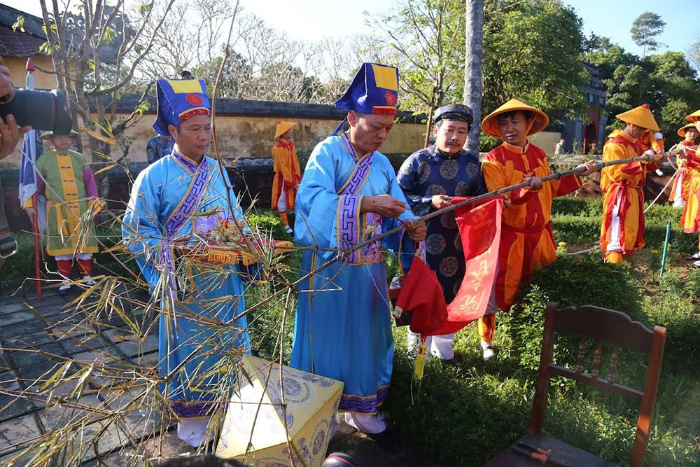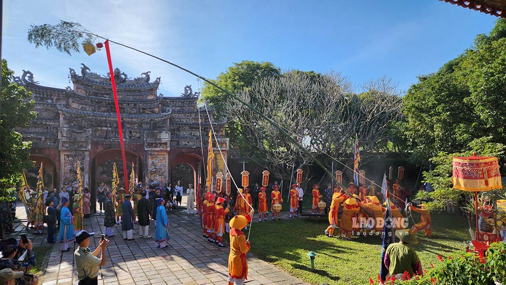 Vào thời Nguyễn, lễ dựng nêu được tổ chức bài bản khi ngoài phướn đỏ, trên ngọn nêu còn treo ấn tín, đoản kiếm, bút lông biểu trưng cho việc phong ấn báo hiệu triều đình nghỉ ngơi khi Tết đến. Ảnh: Phúc Đạt