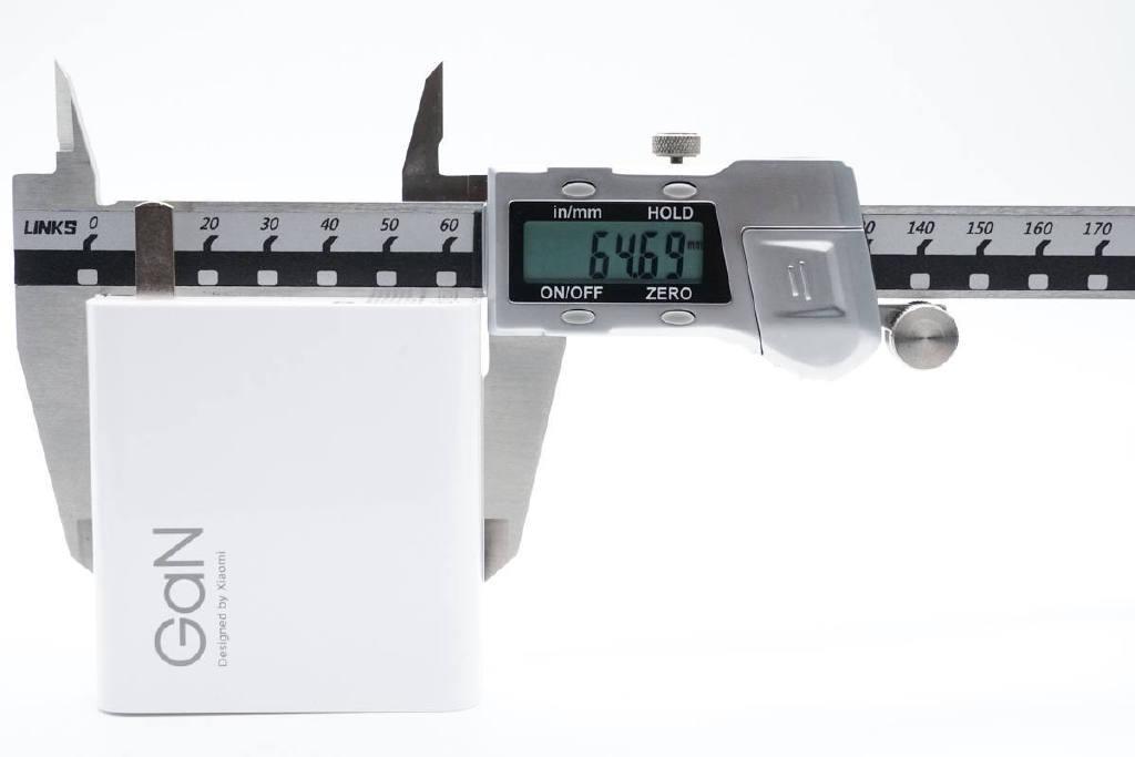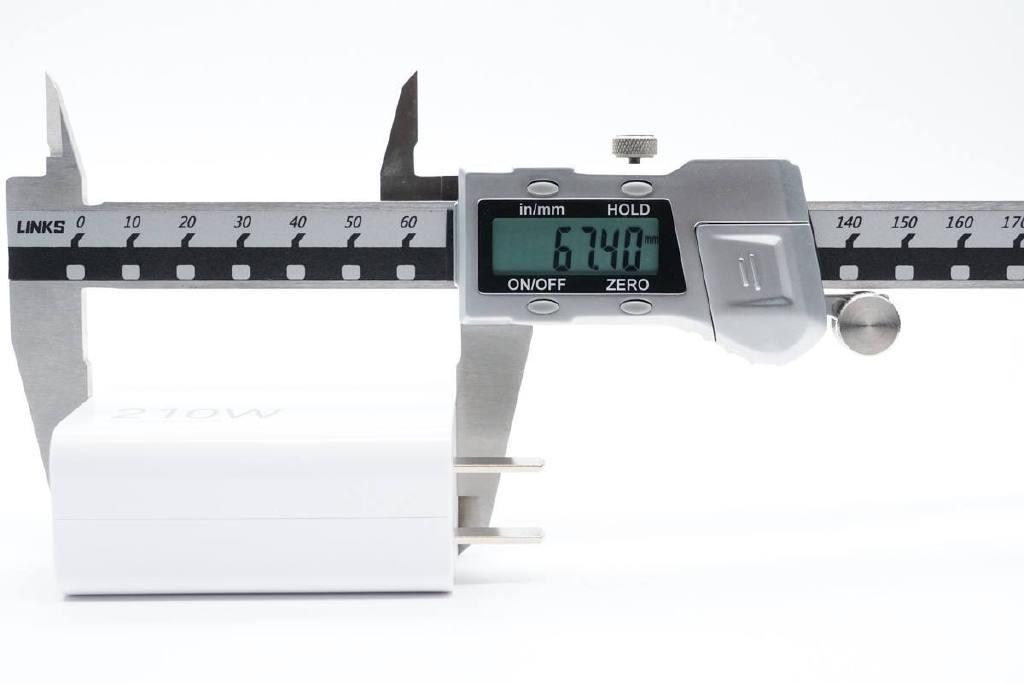 Kích cỡ củ sạc là 67.4 x 64.69 x 29.79mm, mật độ công suất đạt 1.62W/cm³