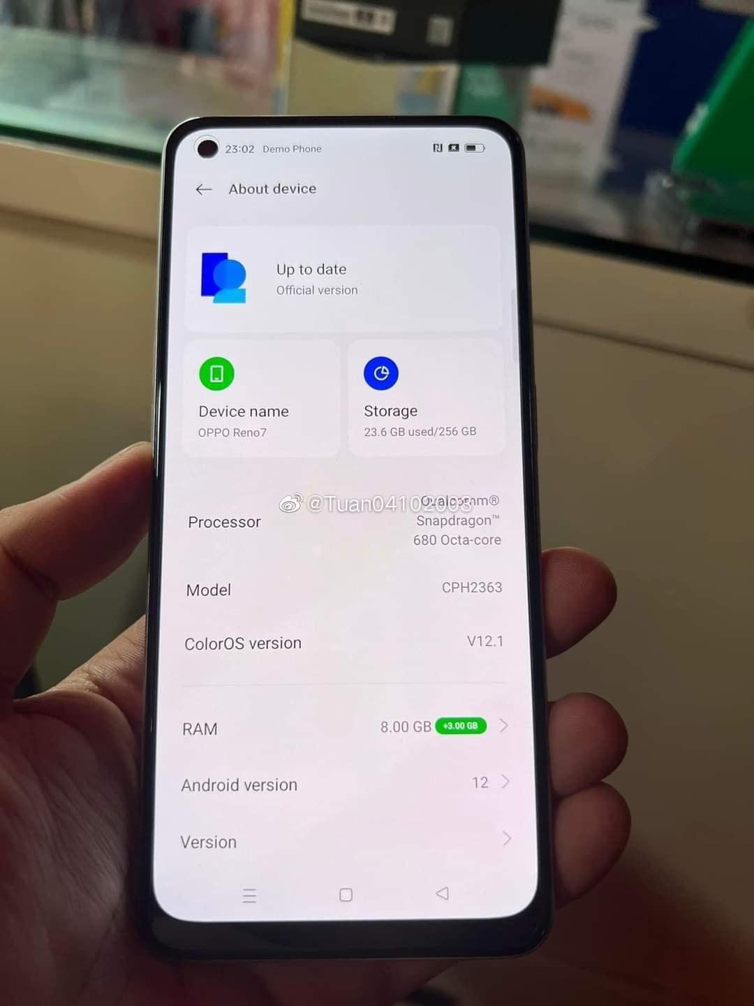 Các hình ảnh thực tế của OPPO Reno7 4G cũng được đăng tải cho thấy ngoại hình của chiếc máy này, đồng thời tiết lộ một vài thông số cấu hình. Theo đó máy sẽ trang bị chipset Snapdragon 680, RAM 8GB (hỗ trợ RAM ảo), bộ nhớ lưu trữ 256GB (có thể có thêm các tuỳ chọn khác), chạy sẵn trên Android 12 với giao diện ColorOS 12.1 khi ra mắt.