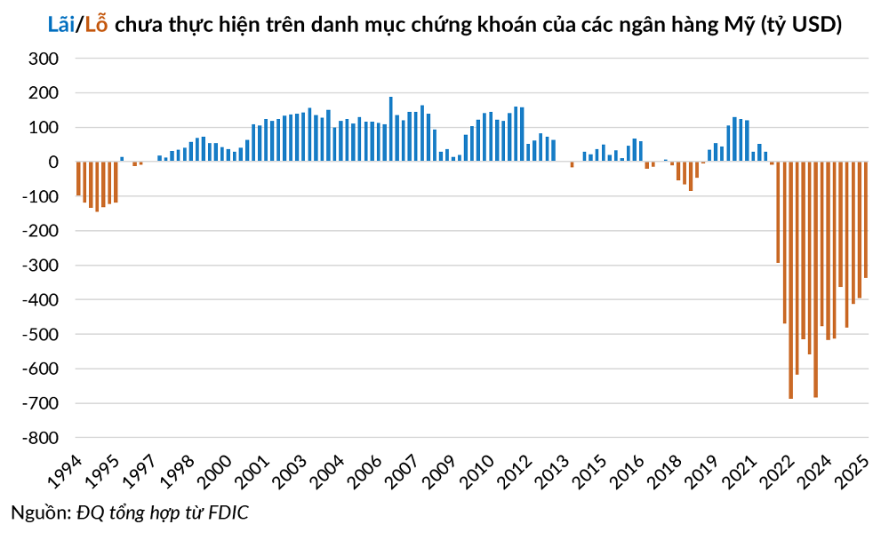 Hệ thống ngân hàng Mỹ vẫn chưa thực sự thoát khỏi bóng ma của cuộc khủng hoảng Silicon Valley Bank năm 2023. Theo báo cáo từ Tập đoàn Bảo hiểm Tiền gửi Liên bang (FDIC), các ngân hàng Mỹ đang ngồi trên khoản lỗ chưa thực hiện (unrealized losses) trị giá 337 tỷ USD vì lãi suất cao làm suy giảm giá trị danh mục trái phiếu.