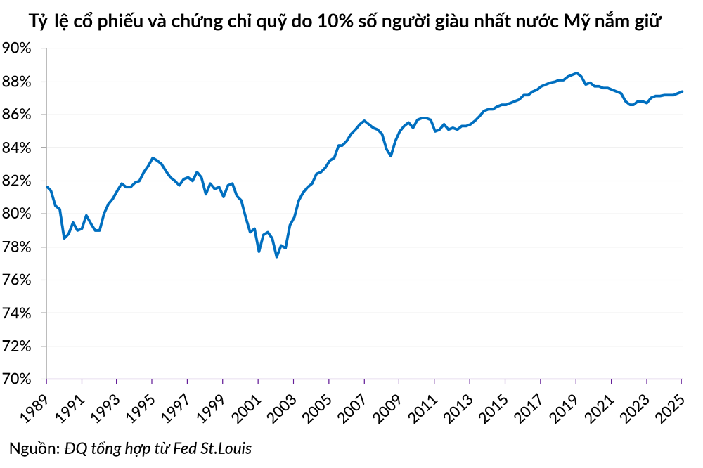 Dữ liệu từ Fed cho thấy top 10% hộ gia đình Mỹ sở hữu 87% giá trị cổ phiếu và chứng chỉ quỹ, ttrong khi 50% số gia đình nghèo nhất chỉ nắm giữ 1% thị trường chứng khoán.