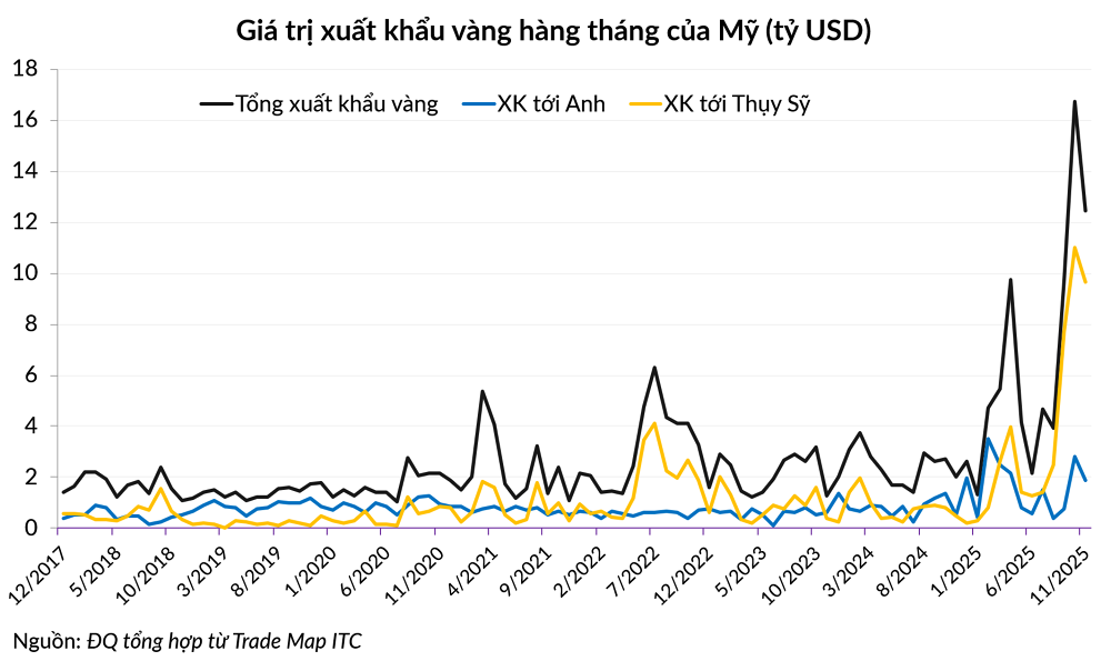 Phía xuất khẩu cũng có một diễn biến đáng chú ý. Xuất khẩu của Mỹ quả thực có đi lên, nhưng đóng góp chủ yếu vào xu hướng này là vàng bạc. Trong 11 tháng đầu năm, Mỹ đã bán ra nước ngoài lượng vàng trị giá 75 tỷ USD, tăng 178% so với cùng kỳ 2024. Điểm đến lớn nhất là Thụy Sỹ - trung tâm tinh luyện vàng của thế giới.