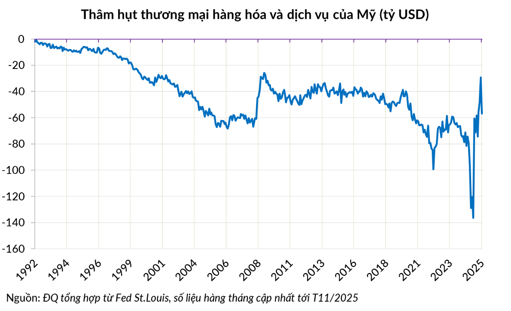 Nguy hiểm hơn, sự suy giảm nhập khẩu của Mỹ (do thuế quan và gom hàng trước) đang dẫn đến một rủi ro ít ai ngờ tới: Sự khan hiếm USD toàn cầu.