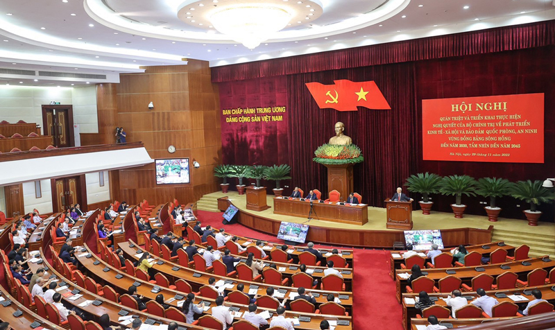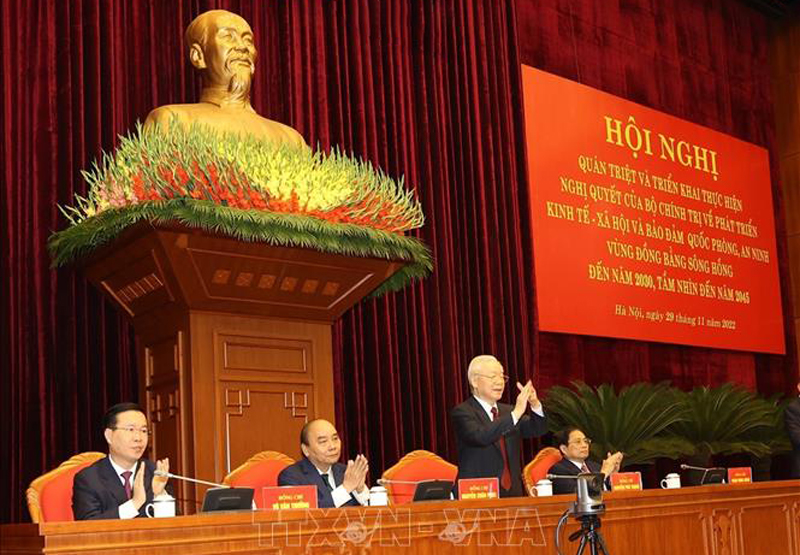 Sáng 29-11, Bộ Chính trị tổ chức hội nghị trực tiếp kết hợp trực tuyến quán triệt, triển khai thực hiện Nghị quyết số 30-NQ/TƯ ngày 23-11-2022 của Bộ Chính trị khóa XIII về “Phát triển kinh tế - xã hội và bảo đảm quốc phòng, an ninh Vùng đồng bằng sông Hồng đến năm 2030, tầm nhìn đến năm 2045”.