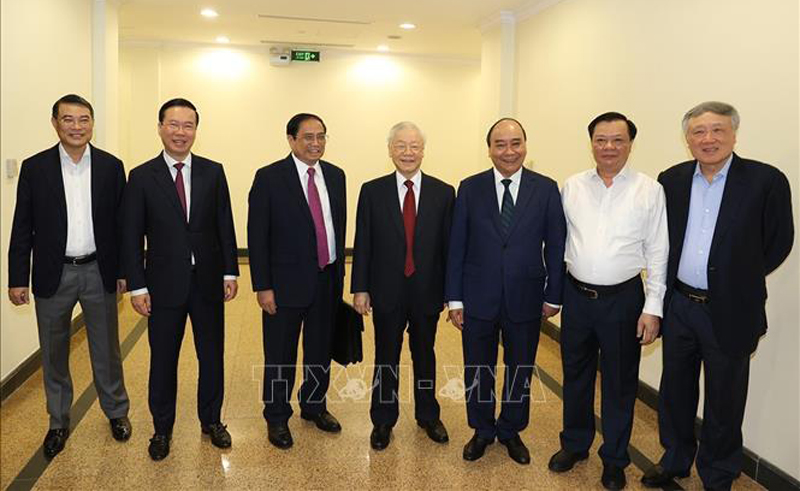 Tổng Bí thư Nguyễn Phú Trọng cùng các đồng chí lãnh đạo Đảng và Nhà nước chủ trì hội nghị. Ảnh: Trí Dũng/TTXVN