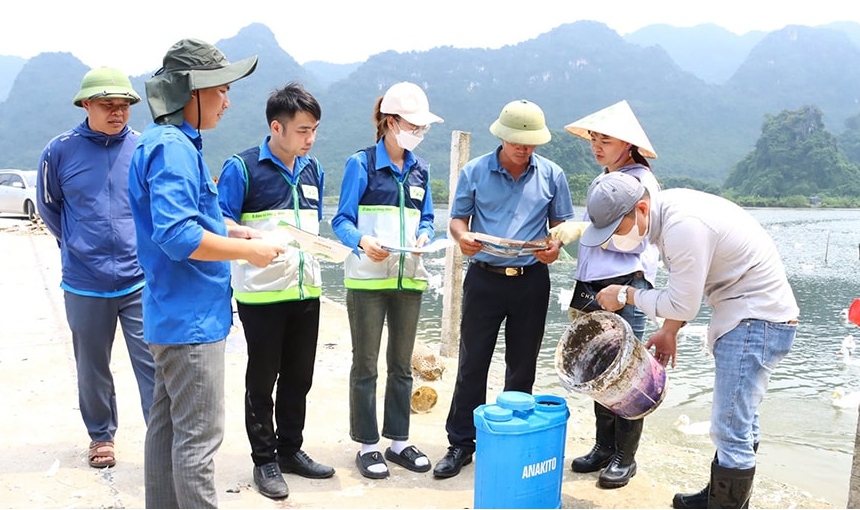 Cán bộ Trung tâm Khuyến nông Hà Nội hỗ trợ kỹ thuật chăn nuôi cho các hộ dân xã Mỹ Đức. Ảnh: Nguyễn Vàn