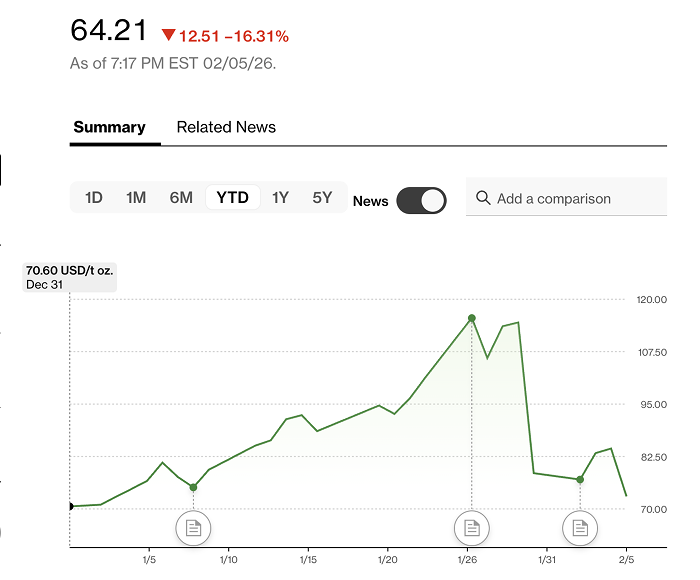 Tại thời điểm 7h28 sáng ngày 6/2, giá bạc giao trong tháng 3 lao dốc 16% xuống 64 USD/ounce. Như vậy, so với mức đỉnh gần 120 USD/ounce thiết lập vào tuần trước, giảm bạc hiện chỉ bằng còn một nửa.