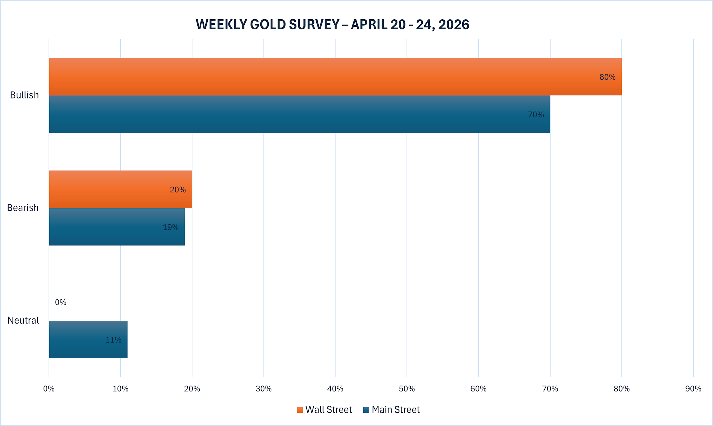 Khảo sát vàng hàng tuần mới nhất của Kitco News cho thấy, cả giới phân tích Phố Wall và nhà đầu tư nhỏ lẻ (Phố Chính) đã quay lại với xu hướng lạc quan, sau khi giá vàng ghi nhận tuần tăng thứ tư liên tiếp.