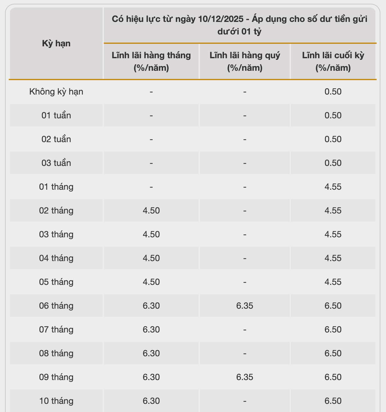 Theo khảo sát của PV Báo Lao Động ngày 11.12.2025, lãi suất tiết kiệm kỳ hạn 13 tháng trong hệ thống ngân hàng dao động quanh ngưỡng 4,4 - 9%.