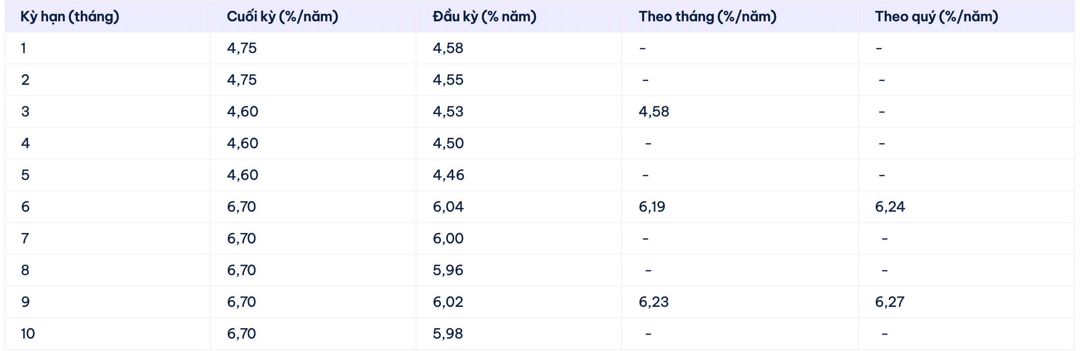 Vikki Bank đang niêm yết lãi suất cao nhất kỳ hạn 13 tháng ở mức 6,7%/năm khi khách hàng gửi tiền online, lĩnh lãi cuối kỳ. Ở những kỳ hạn khác, khách hàng niêm yết lãi suất ở mức 0,5-6,7%/năm.