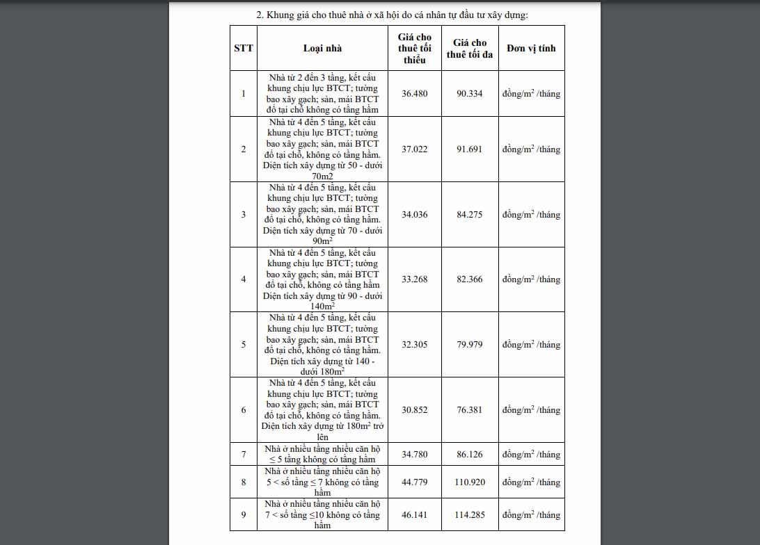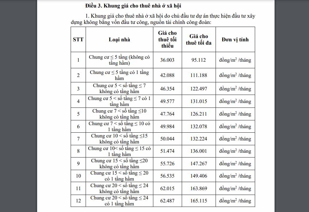 Cao nhất là nhà ở xã hội do chủ đầu tư dự án thực hiện đầu tư xây dựng không bằng vốn đầu tư công, nguồn tài chính công đoàn với chung cư từ 20 - 24 tầng, có 1 tầng hầm, từ: 62.487 - 165.115 đồng/m2 /tháng.