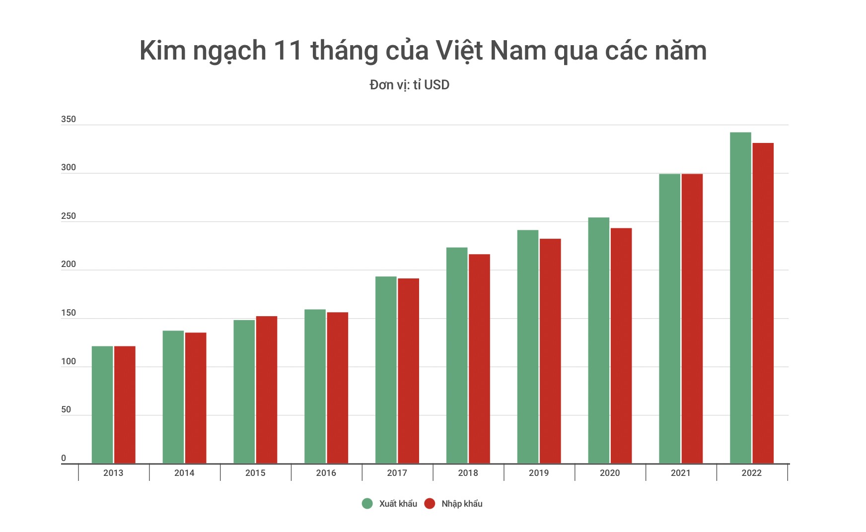 So sánh kim ngạch xuất nhập khẩu của Việt Nam qua các năm. Biểu đồ: Bích Hà