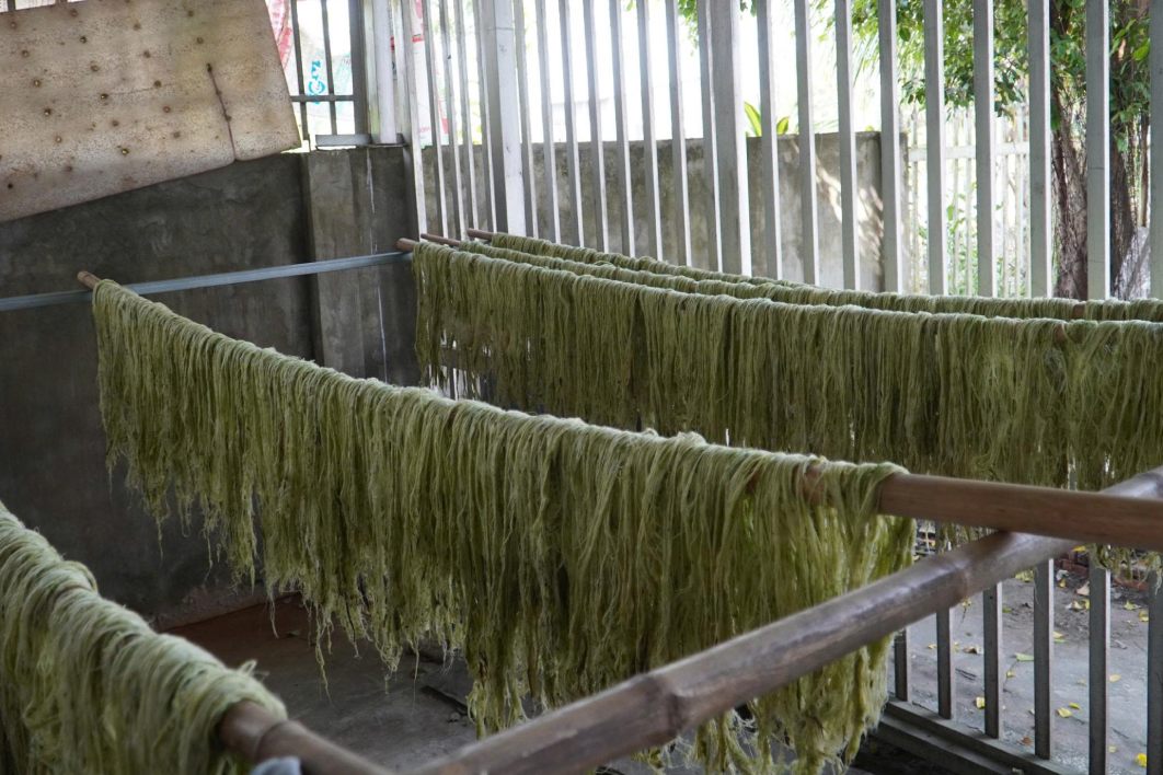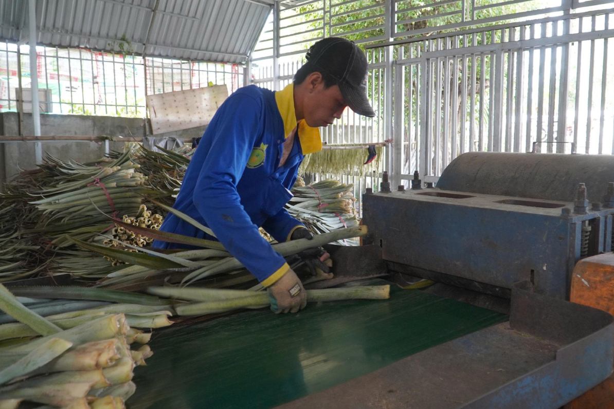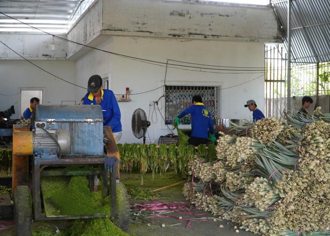 Để có sợi chất lượng, HTX đặc biệt chú trọng khâu chọn nguyên liệu. Lá phải già, dài từ 45 cm trở lên. Sau khi thu gom, lá trải qua nhiều công đoạn: ép, đánh sợi, cắt bỏ phần bám dính, rửa, giặt sạch, sấy ly tâm, phơi khô và đóng gói.