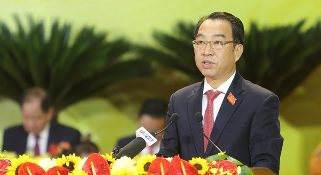 Chủ tịch UBND tỉnh Lữ Quang Ngời trình bày báo cáo tổng kết nhiệm kỳ 2020 - 2025 tại Đại hội đại biểu Đảng bộ tỉnh Vĩnh Long lần thứ I. Ảnh: Phong Linh