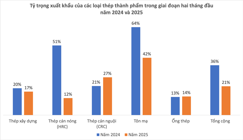 Theo đó, trong hai tháng đầu năm nay, tỷ trọng xuất khẩu chiếm 42% trong cơ cấu các thị trường tiêu thụ tôn mạ, giảm so với 64% của cùng kỳ năm ngoái. Mức độ cạnh phụ thuộc vào xuất khẩu này đang cao gấp đôi so với bình quân của cả ngành thép (khoảng 21%).