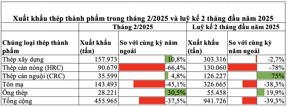 Xuất khẩu thép thành phẩm trong tháng 2/2025 và luỹ kế 2 tháng đầu năm 2025 (Nguồn: VSA, H.Mĩ tổng hợp).