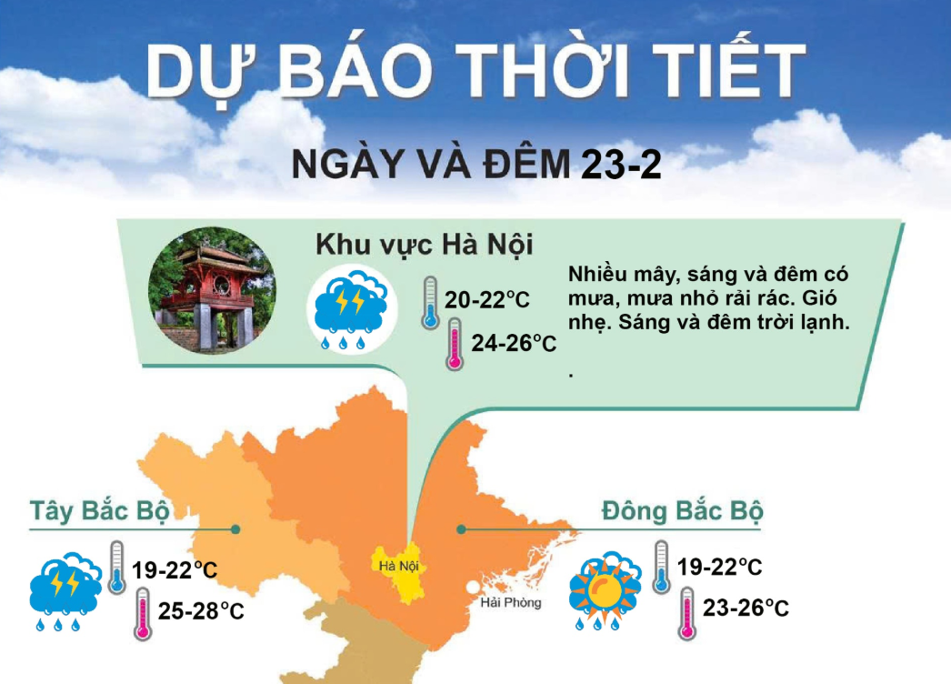 Hôm nay (23-2), Hà Nội nhiều mây, sáng và đêm có mưa, mưa nhỏ rải rác. Gió nhẹ. Sáng và đêm trời lạnh.