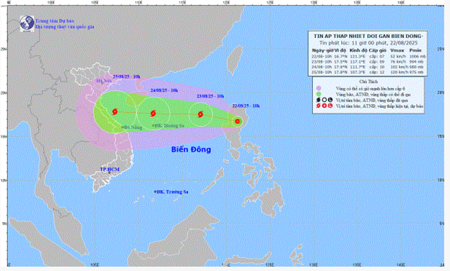 Theo Trung tâm dự báo khí tượng thủy văn quốc gia, hồi 10 giờ ngày 22-8, vị trí tâm áp thấp nhiệt đới ở vào khoảng 16,7 độ Vĩ Bắc; 121,3 độ Kinh Đông, trên đất liền đảo Lu-Dông (Philippin). Sức gió mạnh nhất ở vùng gần tâm áp thấp nhiệt đới mạnh cấp 6-7 (39-61km/h), giật cấp 9; di chuyển theo hướng Tây Bắc với tốc độ 10-15km/h.