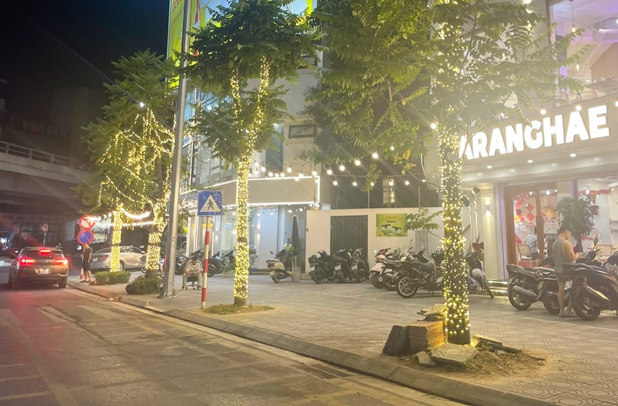 Tại khu vực trước cửa quán ăn ở số 199 phố Nguyễn Văn Cừ (phường Bồ Đề), 4 cây xanh dọc vỉa hè bị quấn kín dây đèn từ gốc lên thân. Các dây đèn nhỏ được lắp dày, ôm sát lớp vỏ, phát sáng liên tục suốt buổi tối nhằm tạo điểm nhấn thu hút khách.