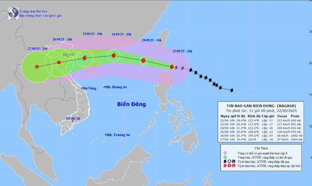 Cập nhật vị trí và đường đi của bão Ragasa vào 11 giờ ngày 22.9. Nguồn: Trung tâm Dự báo Khí tượng Thủy văn Quốc gia