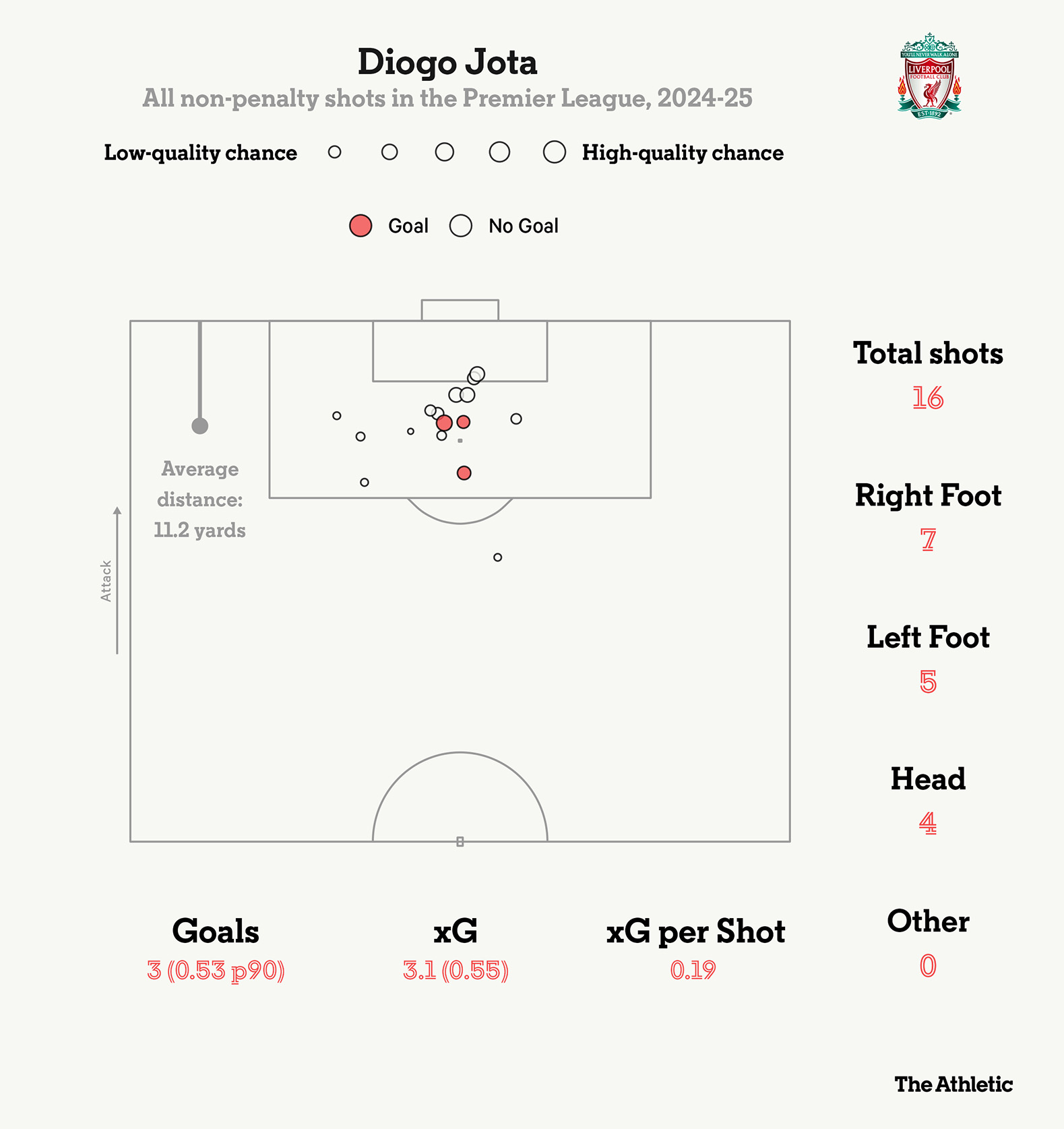 Thống kê các cú dứt điểm của Diogo Jota và Darwin Nunez tại Premier League mùa này. Ảnh: The Athletic