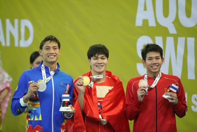 Trần Hưng Nguyên (giữa) giành Huy chương Vàng đầu tiên cho Đội tuyển bơi Việt Nam. Ảnh: Minh Dân
