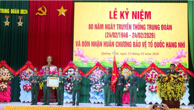Sáng 24.2, Trung đoàn 24, Sư đoàn 10, Quân đoàn 34 long trọng tổ chức Lễ kỷ niệm 80 năm Ngày truyền thống Trung đoàn (24.2.1946 - 24.2.2026) và đón nhận Huân chương Bảo vệ Tổ quốc hạng Nhì.