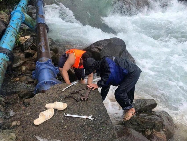 Công nhân HueWACO dầm mưa lũ khắc phục sự cố đảm bảo cấp nước cho công ty. Ảnh: H. My.