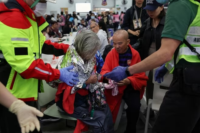 Một phụ nữ được chăm sóc y tế tại điểm sơ tán tạm thời sau vụ hỏa hoạn ở khu chung cư Wang Fuk Court |