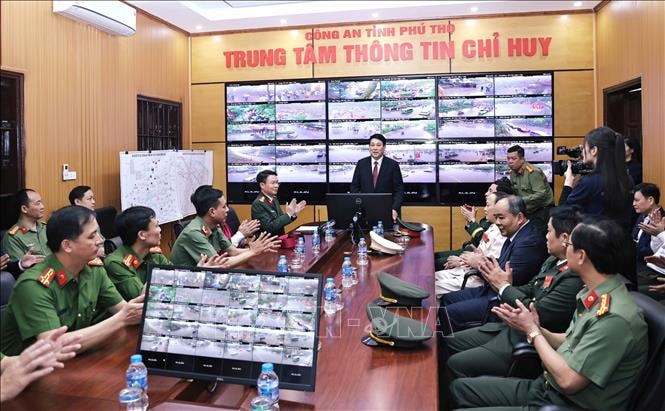 Chủ tịch nước Lương Cường thăm hỏi cán bộ, chiến sĩ Trung tâm thông tin chỉ huy Công an tỉnh Phú Thọ. Ảnh: Lâm Khánh/TTXVN