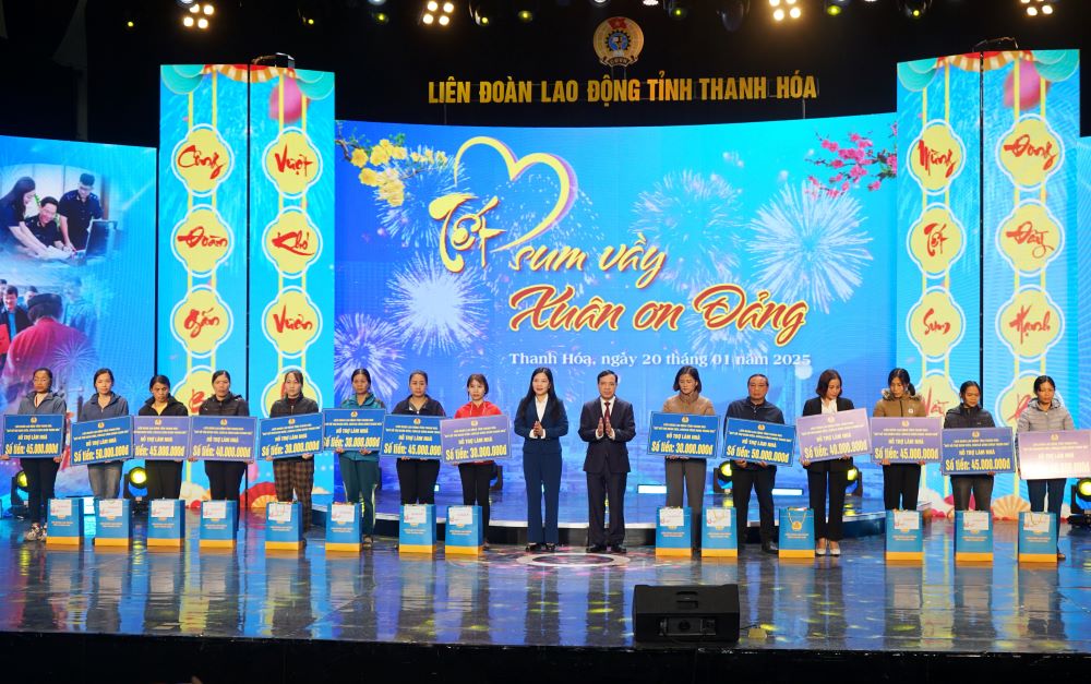 Tại chương trình, đại diện lãnh đạo Tỉnh ủy Thanh Hóa đã trao biểu trưng, khen thưởng 10 gương mặt có thành tích xuất sắc trong năm 2024. Đại diện lãnh đạo tỉnh Thanh Hóa, LĐLĐ tỉnh, huyện Yên Định và huyện Quan Sơn đã trao 800 suất quà cho đoàn viên, người lao động có hoàn cảnh khó khăn; trao hỗ trợ nhà “Mái ấm Công đoàn” cho 15 đoàn viên có hoàn cảnh khó khăn về nhà ở, với tổng giá trị hơn 1,6 tỉ đồng.