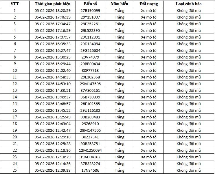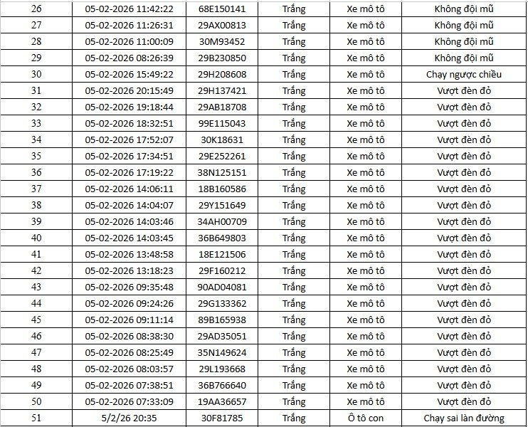 Thông tin từ Cục Cảnh sát giao thông (CSGT) - Bộ Công an cho hay, trong khoảng thời gian từ 12h ngày 5.2 đến 12h ngày 6.2.2026, hệ thống camera ứng dụng trí tuệ nhân tạo (AI) do đơn vị này vận hành đã ghi nhận nhiều trường hợp vi phạm trật tự, an toàn giao thông trên địa bàn Hà Nội và tuyến cao tốc Nội Bài - Lào Cai.