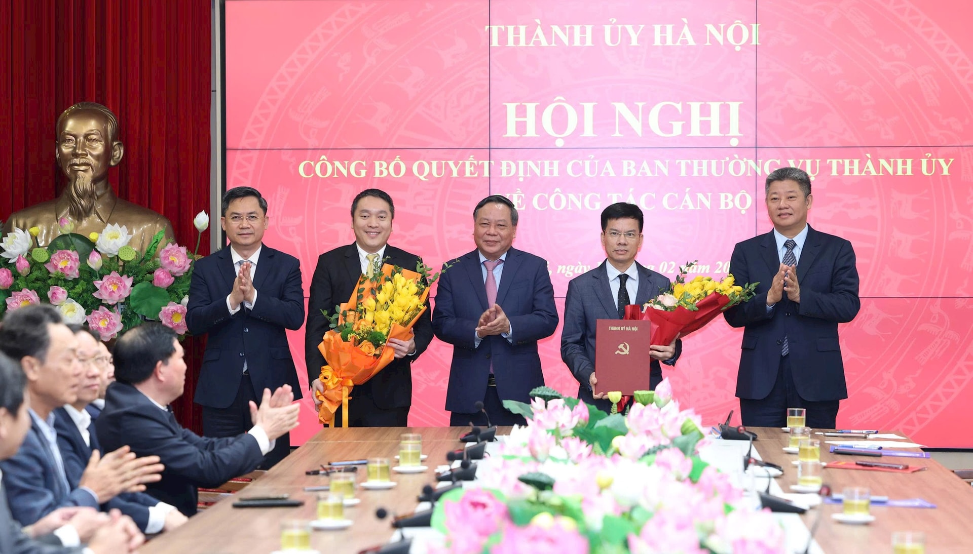 Phó Bí thư Thường trực Thành ủy Hà Nội Nguyễn Văn Phong; Trưởng ban Tổ chức Thành ủy Hà Minh Hải và Phó Chủ tịch UBND thành phố Nguyễn Mạnh Quyền trao quyết định và tặng hoa chúc mừng các đồng chí nhận nhiệm vụ mới. Ảnh: Viết Thành