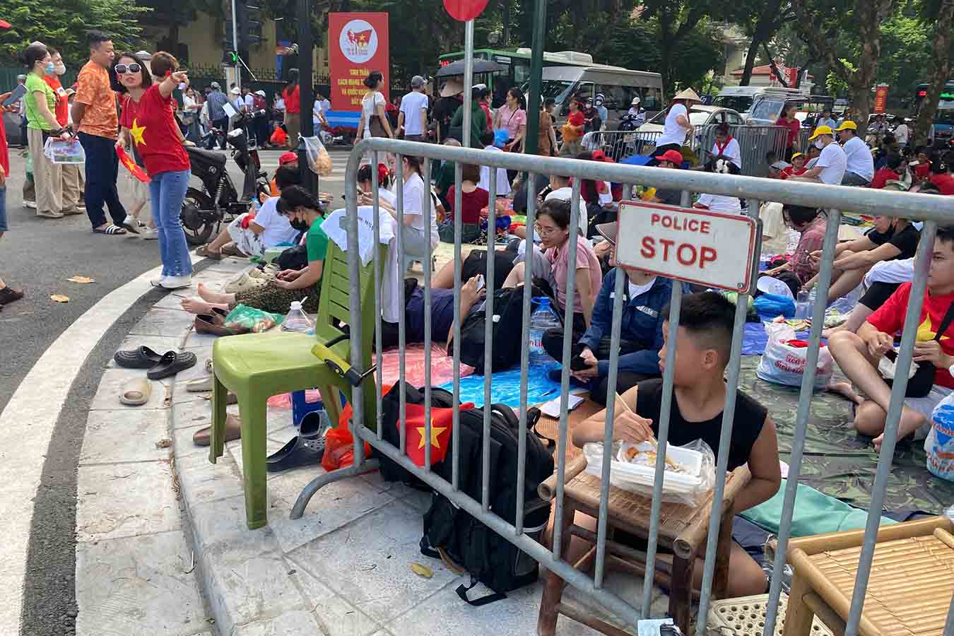 Tại khu vực Hùng Vương - Nguyễn Thái Học - Hàng Cháo, hàng trăm người dân xếp hàng, đứng, ngồi chật kín. Đây được xem là một trong những điểm đẹp nhất để xem tổng hợp luyện diễu binh, diễu hành lần 2.