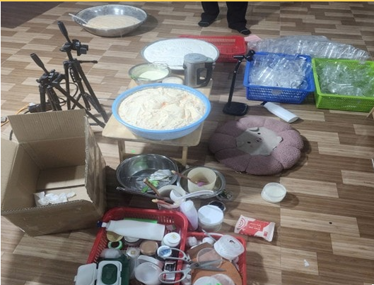 Cơ sở sản xuất có diện tích khoảng 150m2, quy trình sản xuất hoàn toàn thủ công, trên nền gạch không có các biện pháp đảm bảo tiêu chuẩn an toàn trong quá trình sản xuất. Nguyên liệu sản xuất với thành phần chính là bột gạo, sau đó phối trộn với các loại hóa chất, mỹ phẩm khác được mua trôi nổi trên thị trường. Nhiều sản phẩm có chữ nước ngoài (Trung Quốc) nhưng không có nhãn phụ theo quy định.