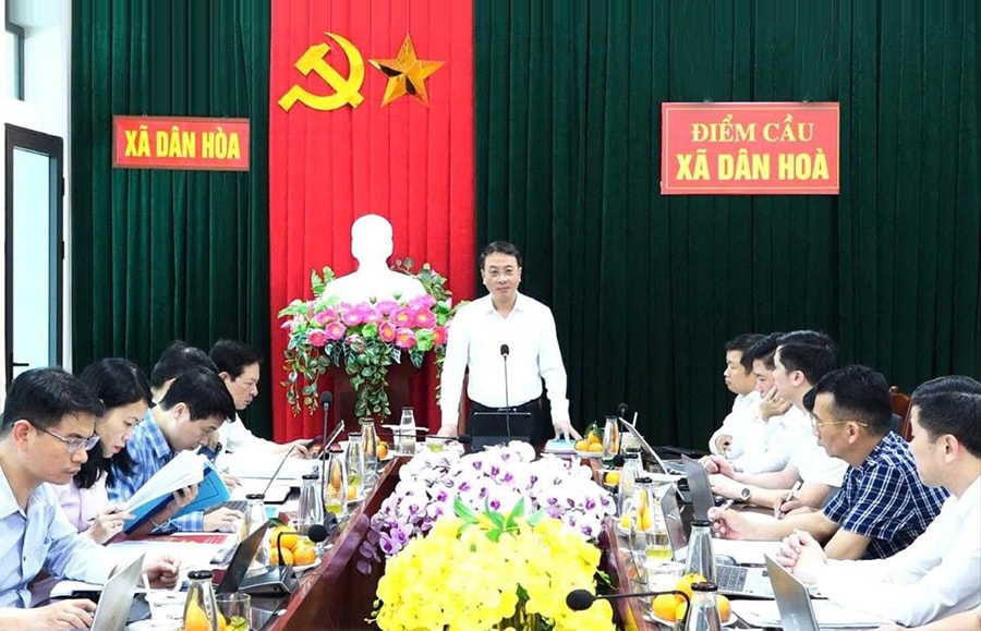 Quang cảnh buổi làm việc của Đoàn kiểm tra số 8, Ban Thường vụ Thành ủy Hà Nội với Ban Thường vụ Đảng ủy xã Dân Hòa về công tác quán triệt, triển khai thực hiện Nghị quyết Đại hội XIV của Đảng, Nghị quyết Đại hội XVIII Đảng bộ thành phố. Ảnh: Huy Kiên
