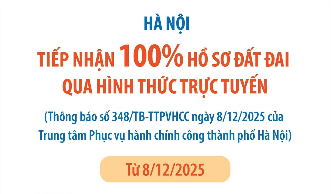 Trung tâm Phục vụ hành chính công thành phố Hà Nội ra thông báo số 348/TB-TTPVHCC ngày 8-12-2025 về việc thực hiện trực tuyến toàn trình thủ tục cung cấp thông tin, dữ liệu đất đai thuộc phạm vi quản lý của UBND thành phố.