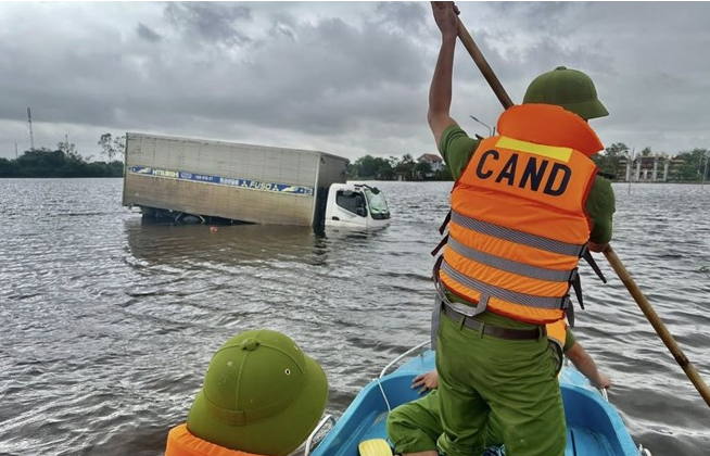 Ngày 28.10, Công an xã Mỹ Thủy xác nhận, đơn vị này đã kịp thời cứu 2 người và giải cứu xe tải chở hải sản đông lạnh mắc kẹt trên QL49C do ngập sâu.