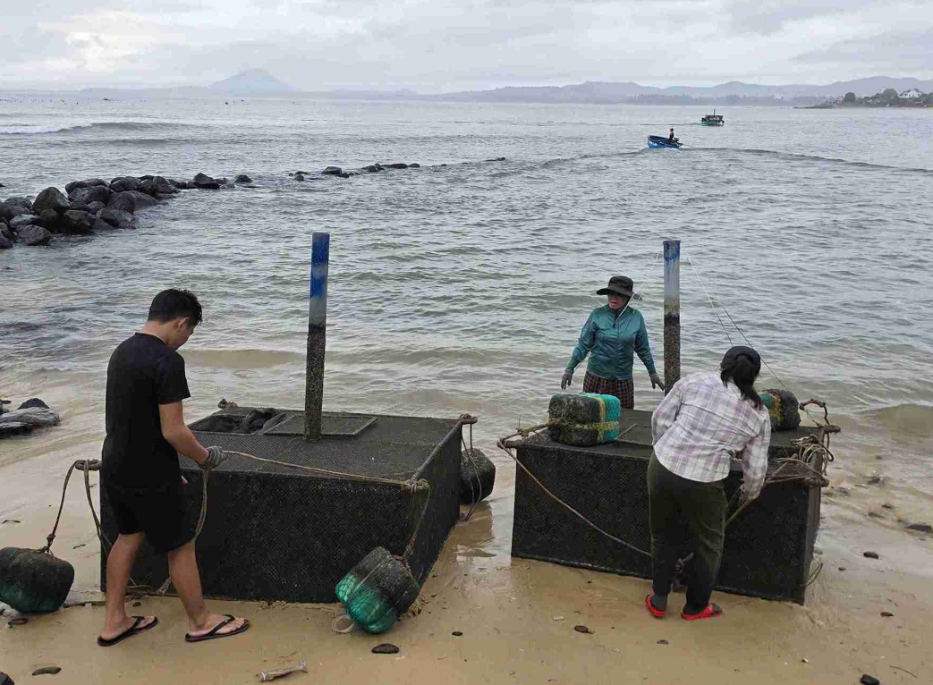 Người dân ven biển Đắk Lắk hối hả đưa tôm hùm “chạy bão”. Ảnh: Hữu Long