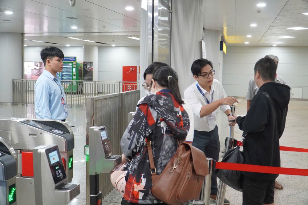 Nhân viên tại ga Bến Thành (Quận 1) có mặt hướng dẫn cho hành khách sử dụng vé trước khi lên tàu Metro. Ảnh: Ngọc Lê