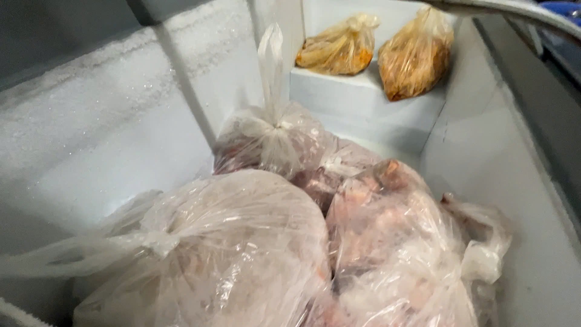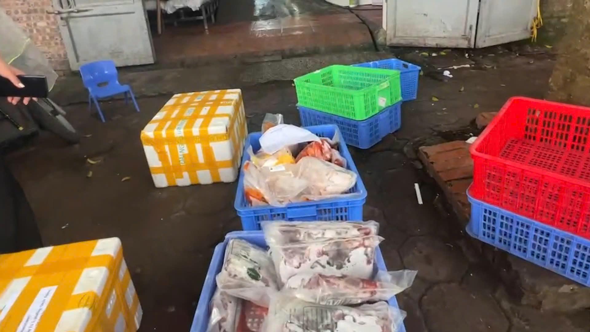 Tại khu vực tủ đông, phóng viên ghi nhận, bên trong chứa nhiều túi chân giò đông lạnh đã được chặt sẵn và hai túi nilon lớn đựng thịt gà đã qua tẩm ướp. Nhân viên bếp tiết lộ đây là số nguyên liệu tồn từ trước: "Hôm trước bên em nhập đồ tươi về để chế biến, nhưng khách báo hủy đột xuất nên phải bảo quản trong tủ đông".